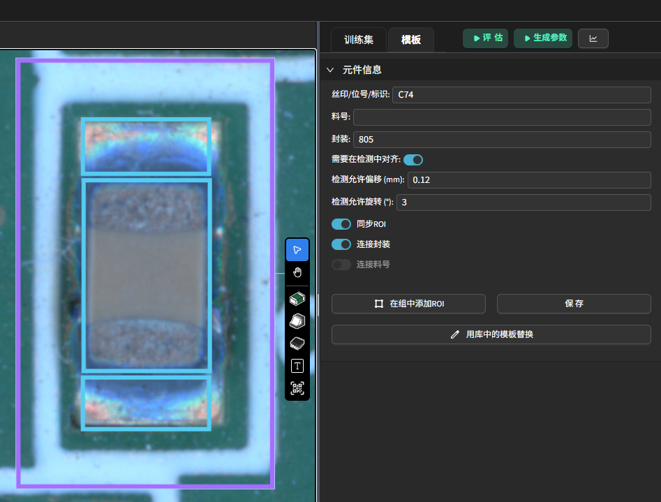 链接料号 :关联该元件至对应料号分组,便于同料号元件批量训练与参数同步。关闭后,该元件不参与料号组的参数继承。