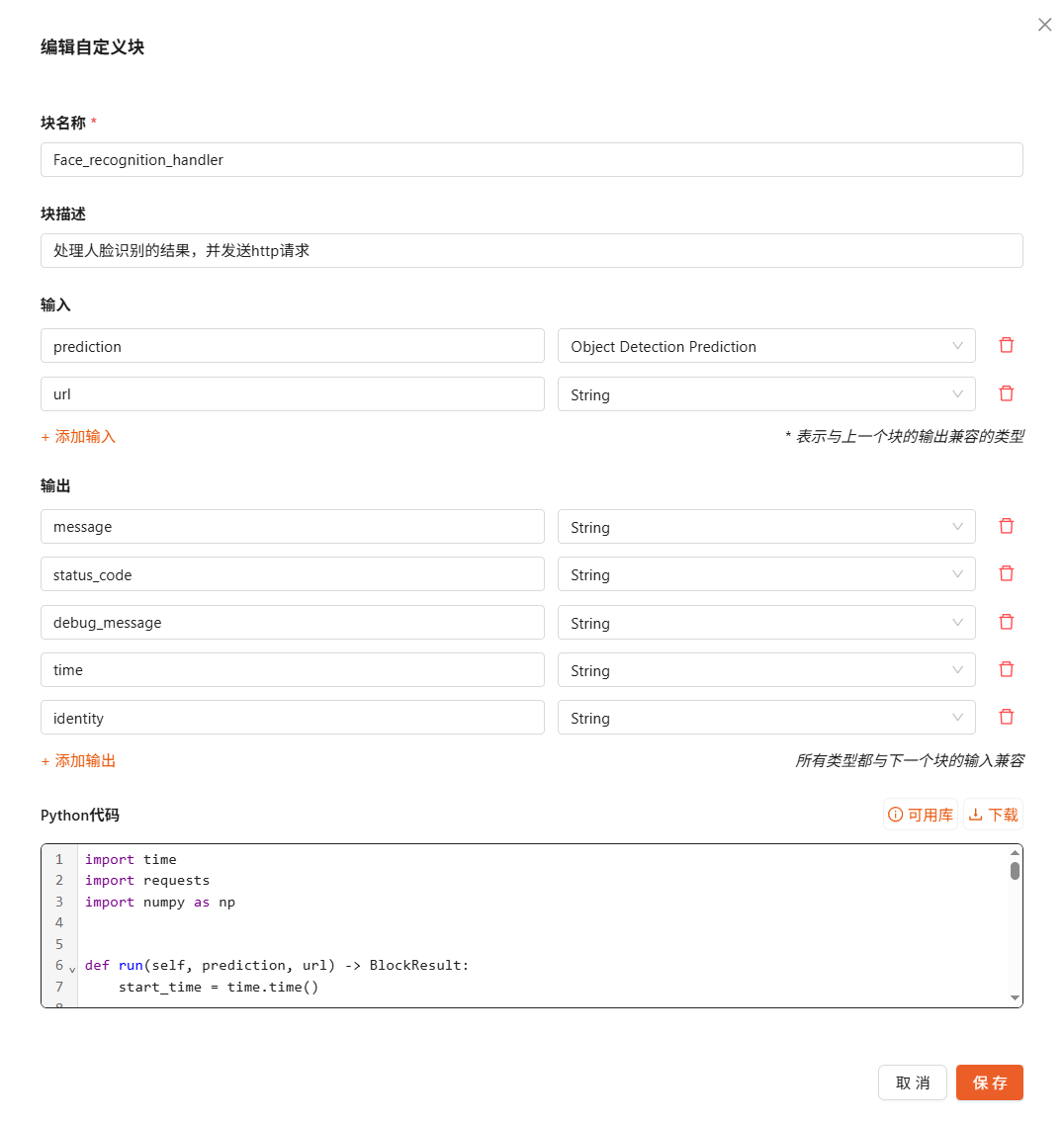 自定义 Python 模块:整理身份识别结果,构造消息并向外部服务 url 发送 HTTP POST;返回状态码与调试信息。