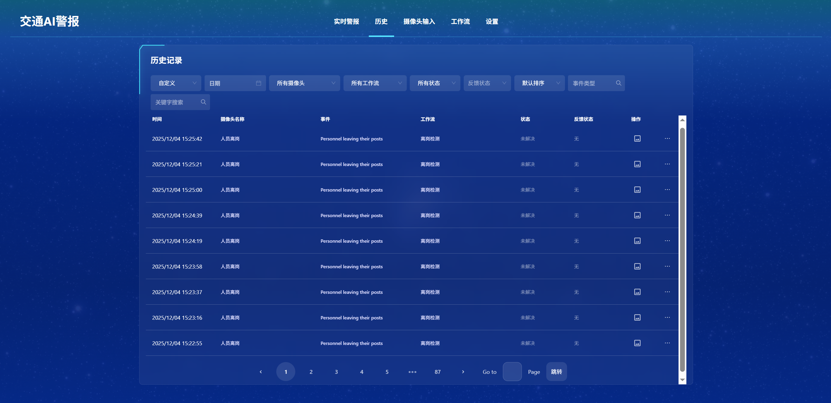您可以在 实时警报 页面查看当前产生的报警条目,点击任意一条即可打开报警详情。 也可以通过顶部导航进入 历史 页面,查看所有历史报警记录并支持筛选与导出。