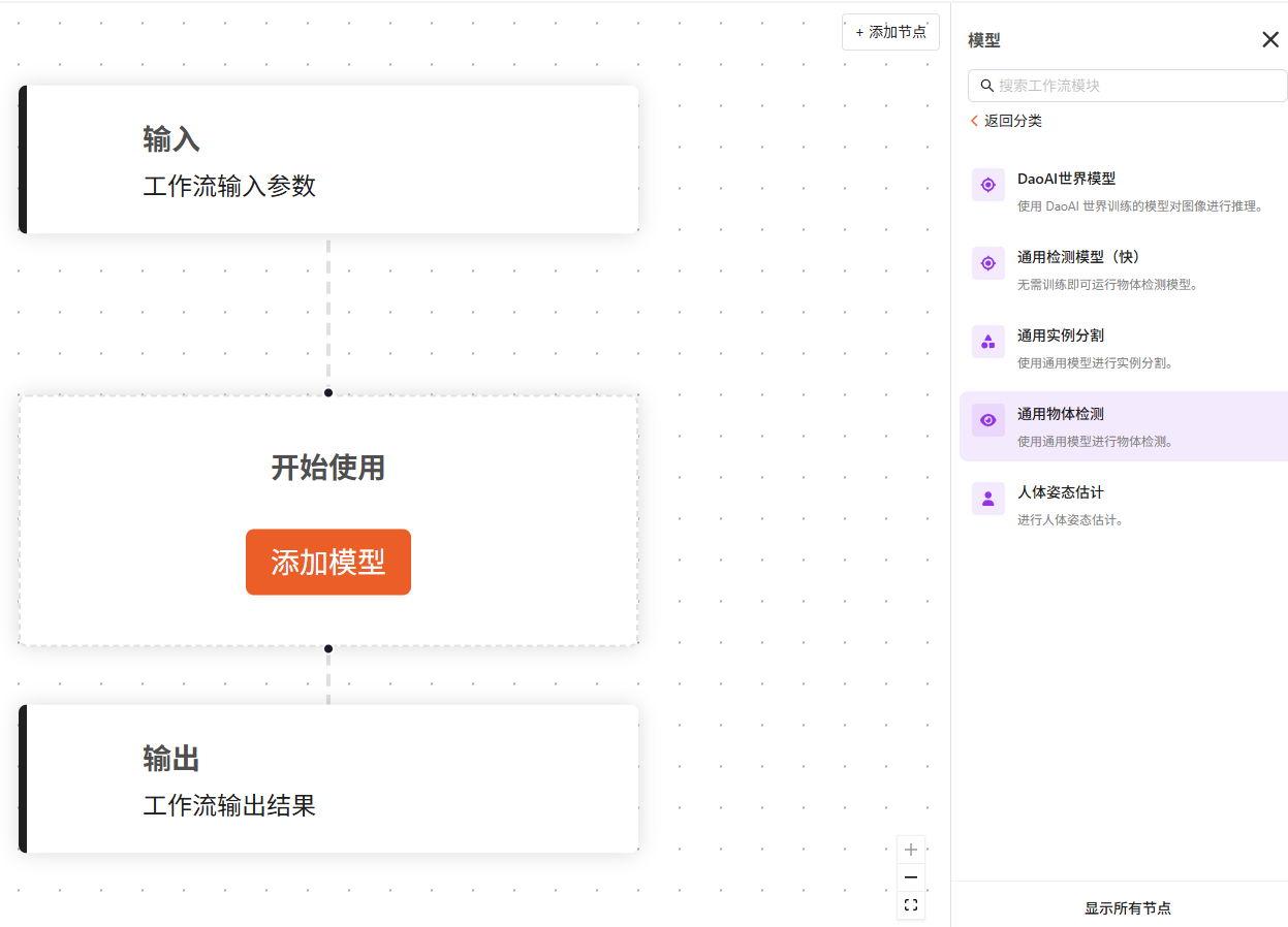 本节将带您在 DaoAI 天眼平台中,从零开始创建并运行您的第一个工作流。 通过一个完整示例,您将了解如何在可视化界面中连接各个功能模块, 并运行一条从数据输入到模型推理再到业务输出的完整 AI 视觉流程。
