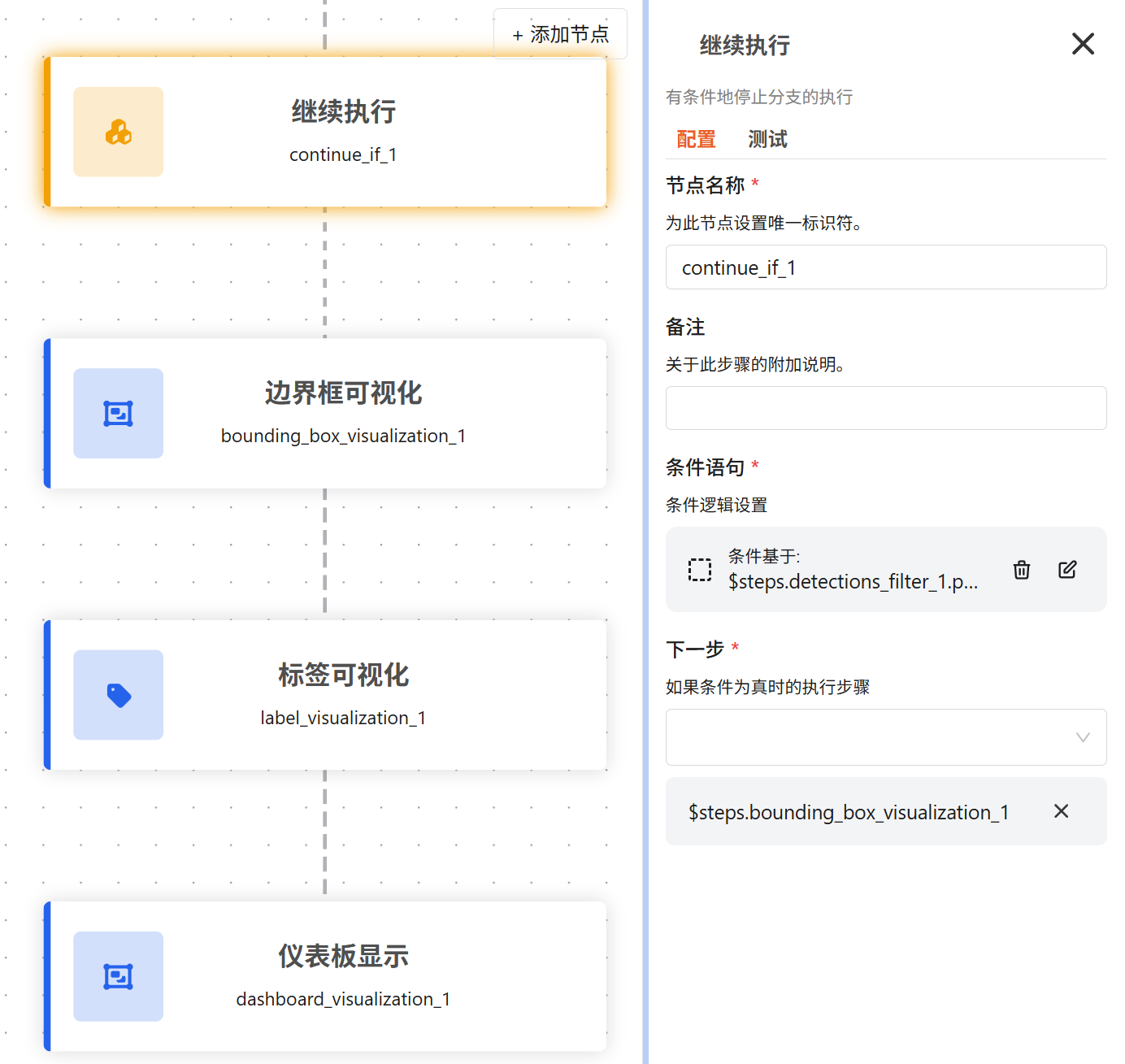 下一步参数配置为对应的可视化模块,使工作流在条件满足后继续执行该可视化节点边界框可视化模块: 在图像上绘制目标检测的边界框;