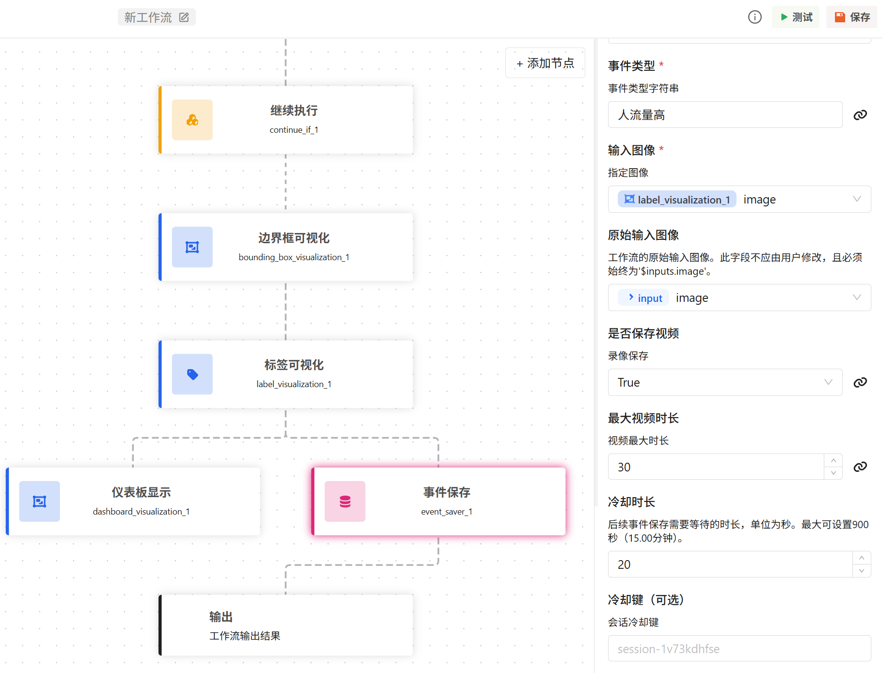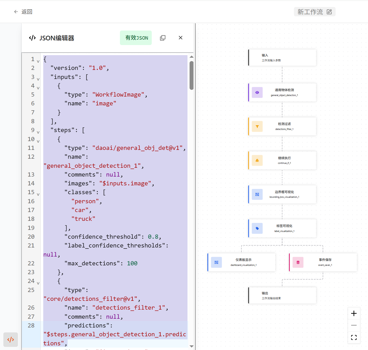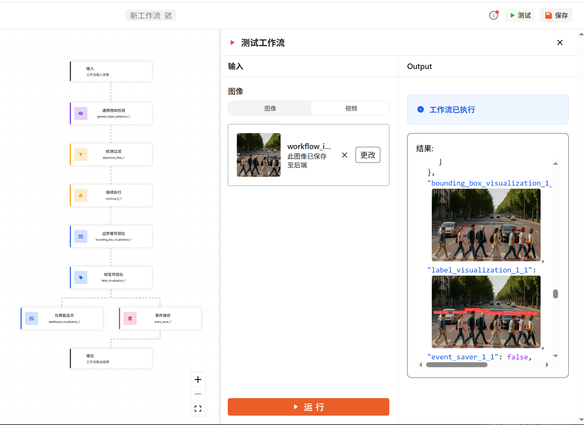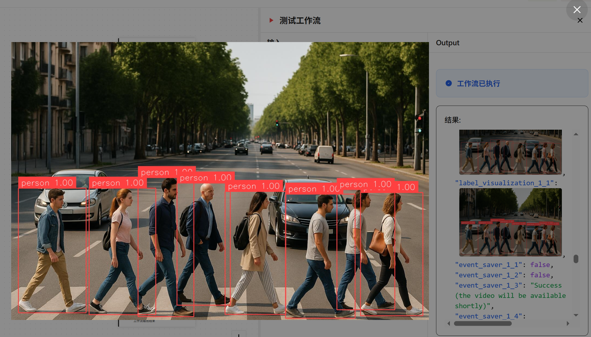 下面示例展示了一个最常见的工作流结构, 实现“目标检测 → 结果可视化 → 输出保存”的完整流程: