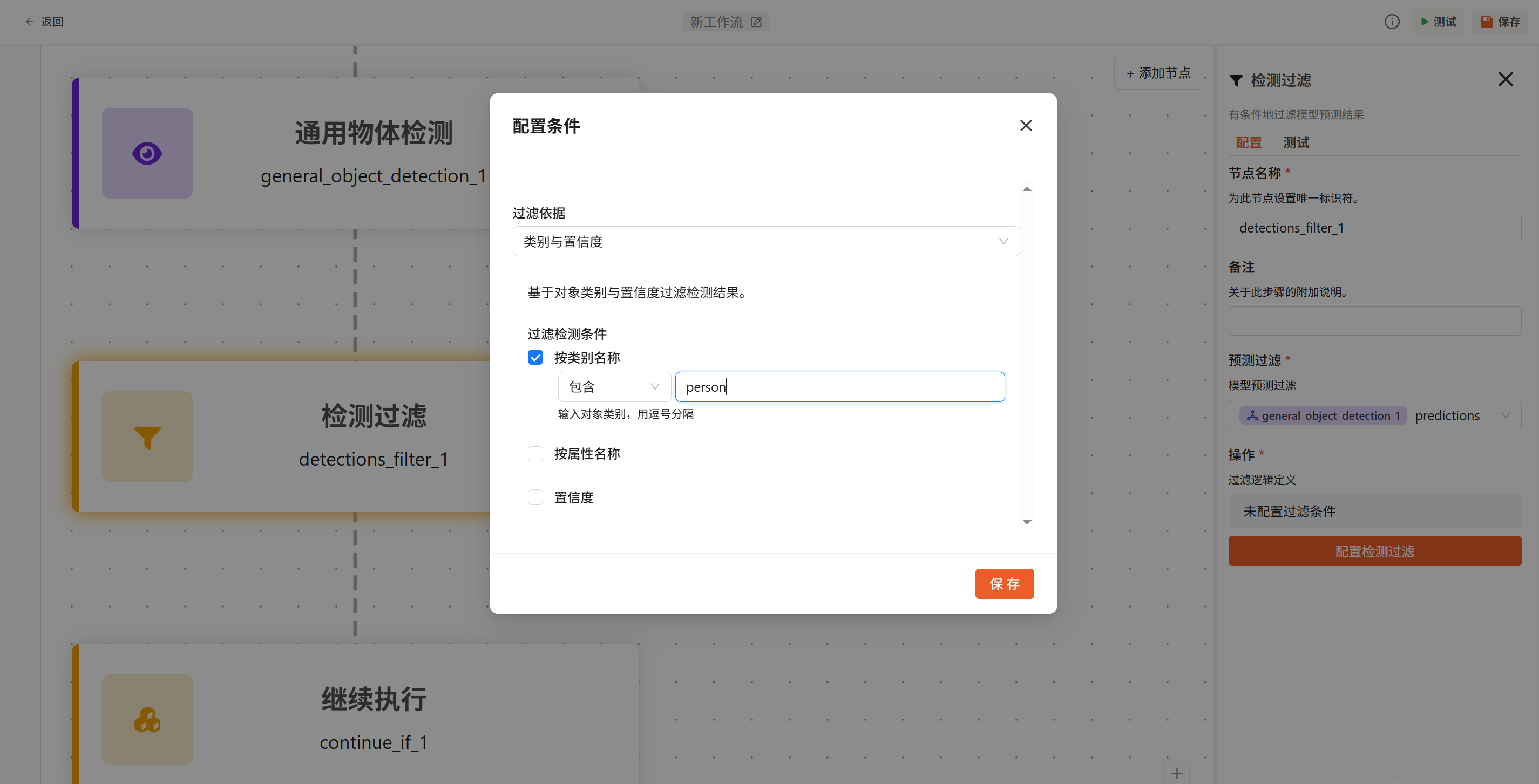 添加后,配置模型的标签,使用英文自然语言输入需要识别的目标类别,例如 person 、 car 、 truck 等。