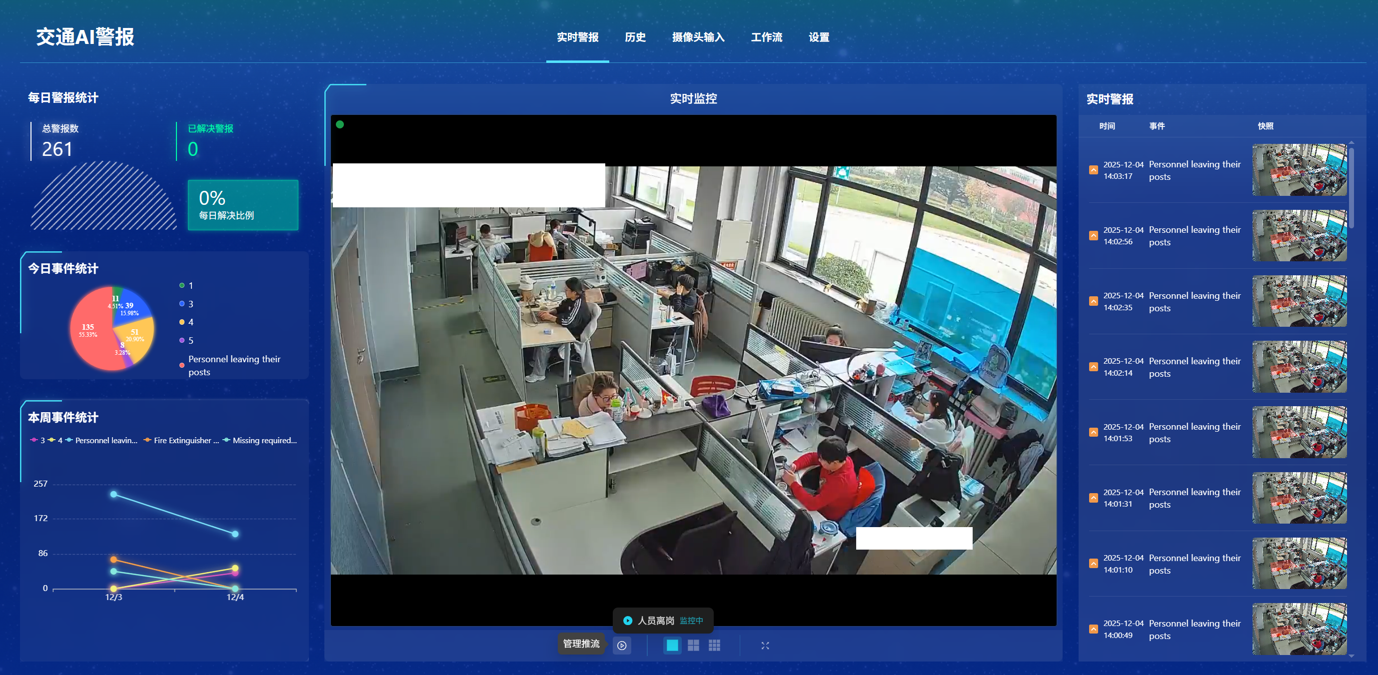 右侧显示 实时事件列表(real-time event list),可及时查看告警条目与状态。